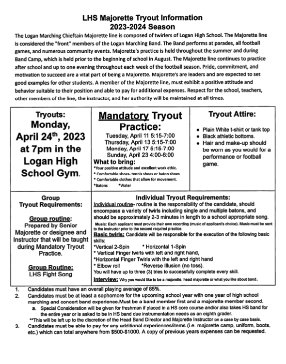 LHS Majorette Tryout Information 2023-2024 Season.Please see attachment for information.