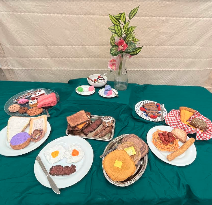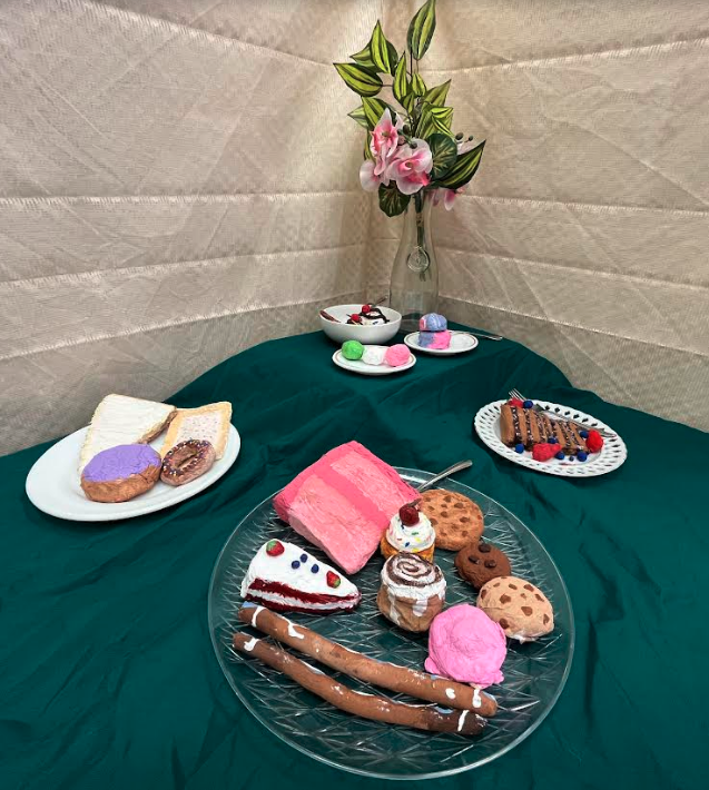 These projects are from the LHS Performing Arts Primer class, taught by Mrs. Riggs. Students studied the area of Props Design, which are the objects in a play that the actors handle or carry or use. They learned how a props designer creates their design, and executes it using skills such as sculpting, painting, welding, construction, and others. The unit culminated with the creation of prop food items. Each item was researched, with students using photos as reference and then creating their foods using only toilet paper and water. After drying, the students then painted their props to be as realistic as possible.