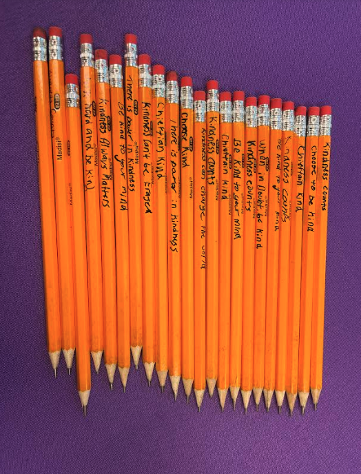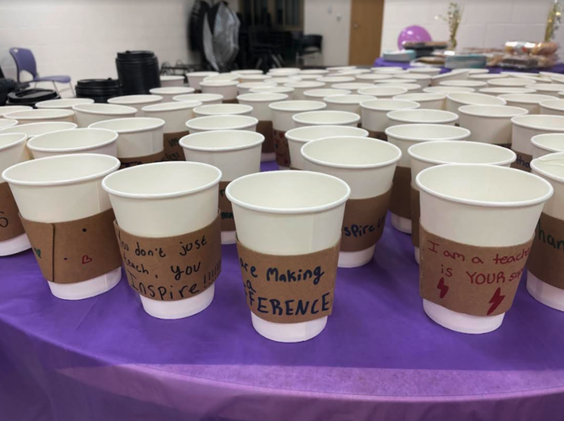 Students in Building Bridges have been working hard to surprise students and staff with a special message this week. They wrote messages on pencils and handed them out to students as they came to school today. They wrote messages to staff on coffee cups and provided them with a coffee, hot chocolate, and tea bar along with many sweet treats.