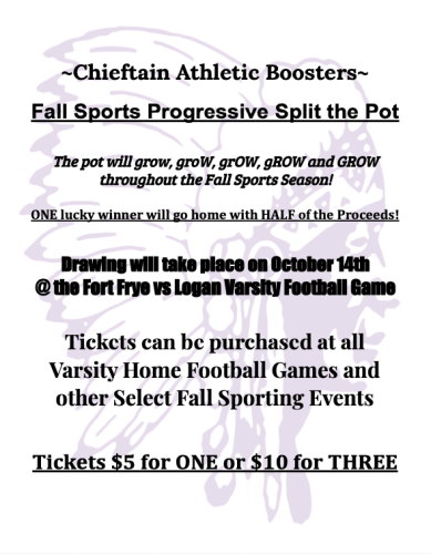 The Logan Athletic Boosters are holding a Fall Sports Progressive Split the Pot! Please see attached flier. Tickets will be sold all week and during the varsity football game against Fort Frye this Friday the 14th. The winning ticket will be drawn during half time and you don't need to be present to win. If you'd like to buy tickets before Friday's game, please email chieftainboosters@gmail.com or stop in the athletic office. Thank you for supporting our student athletes!