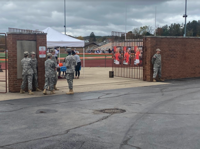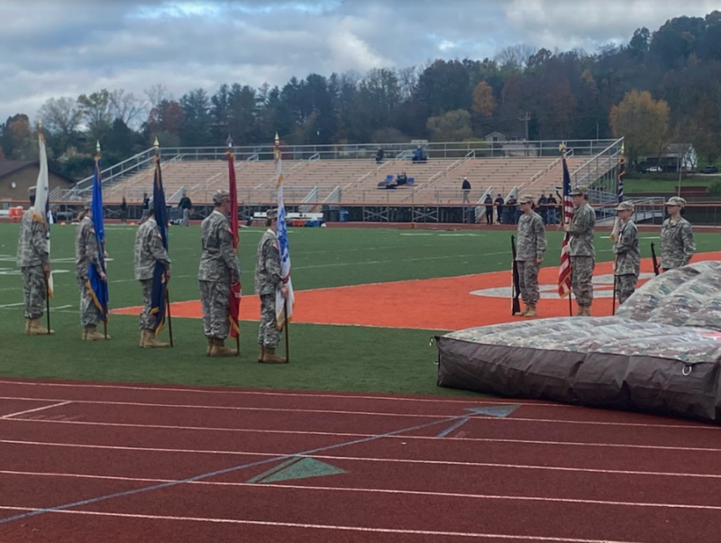 The Logan High School AFJROTC was invited to participate in the military appreciation game for the Hocking College Hawks on Saturday, October 30th, 2021. The cadets greeted guests as they arrived to the Dave Boston Field prior to the game. The cadets, led by c/Lt. Col. James Beatty, stood at the end of the National Guard tunnel for the Hawks to run through. The color guard then took the center field for the National Anthem as well as the coin flip for the game. Click here to view opening ceremony.